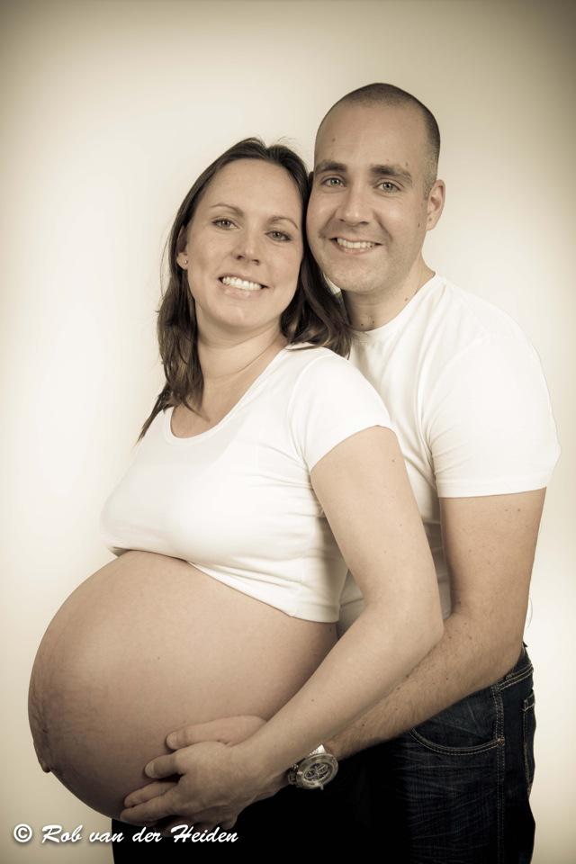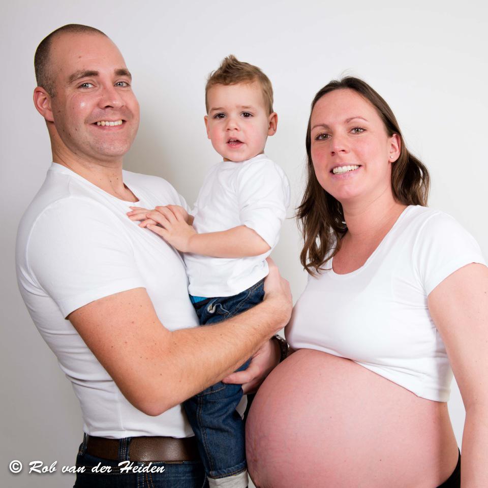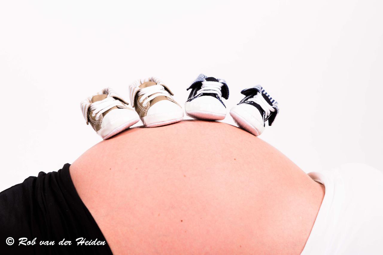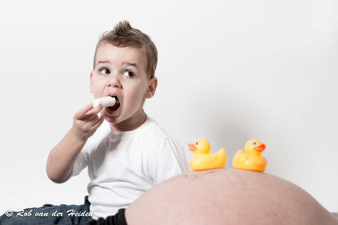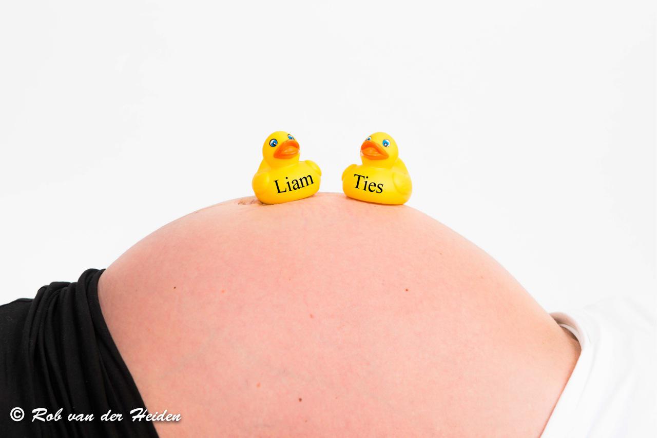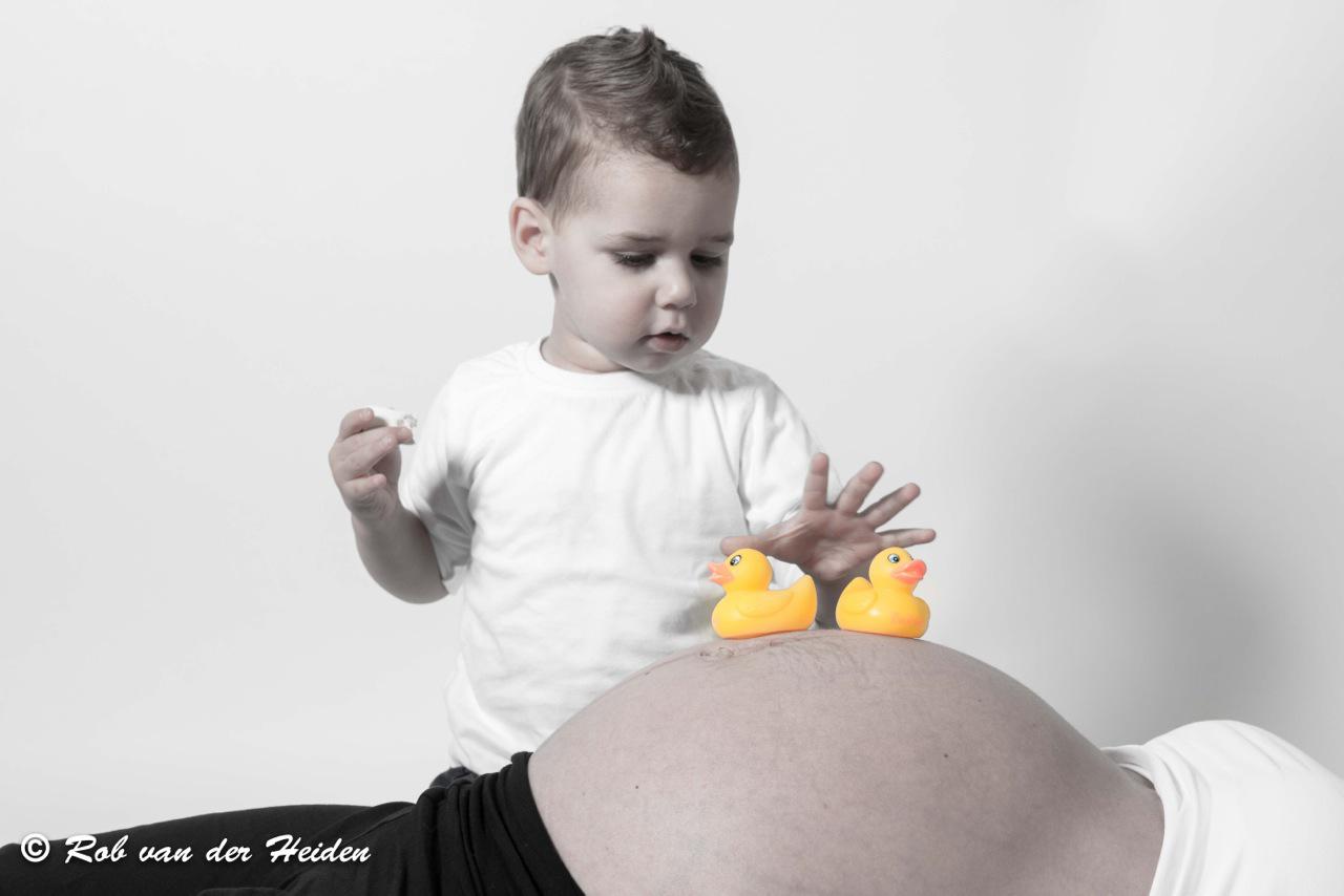 Deze zwangerschapsfotoshoot heeft plaatsgevonden in mijn studio in Schiedam. Kim en Tim wilden graag zwangerschapsfoto's van Kim's dikke buik. Kim was op het moment van de zwangerschapsfotoshoot 33 weken zwanger. Kim wilde ook graag een aantal foto's met haar man Tim en zoontje Mika. Omdat Kim zwanger was van een tweeling vonden we het leuk om een aantal foto's te maken met 2 schoentjes en eendjes op Kim's buik. Omdat een foto gebruikt zou worden voor de geboortekaartjes heb ik later de namen van de baby's op de eendjes gephotoshopt.
